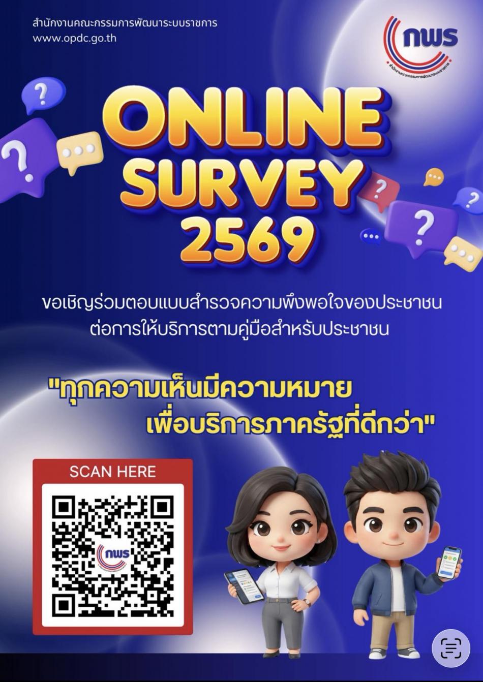 สำนักงาน ก.พ.ร. ขอเชิญร่วมตอบแบบสำรวจความพึงพอใจของประชาชนต่อการให้บริการของหน่วยงานของรัฐปี พ.ศ. 2569 เพื่อประโยชน์ในการพัฒนาบริการภาครัฐและอำนวยความสะดวกแก่ประชาชน โดยสามารถแสดงความเห็นได้ตั้งแต่วันนี้จนถึง 31 สิงหาคม 2569 ได้ที่ลิงก์ https://eoffice.opdc.go.th/l/29f5322e หรือสแกนQR code ที่ปรากฏด้านล่าง